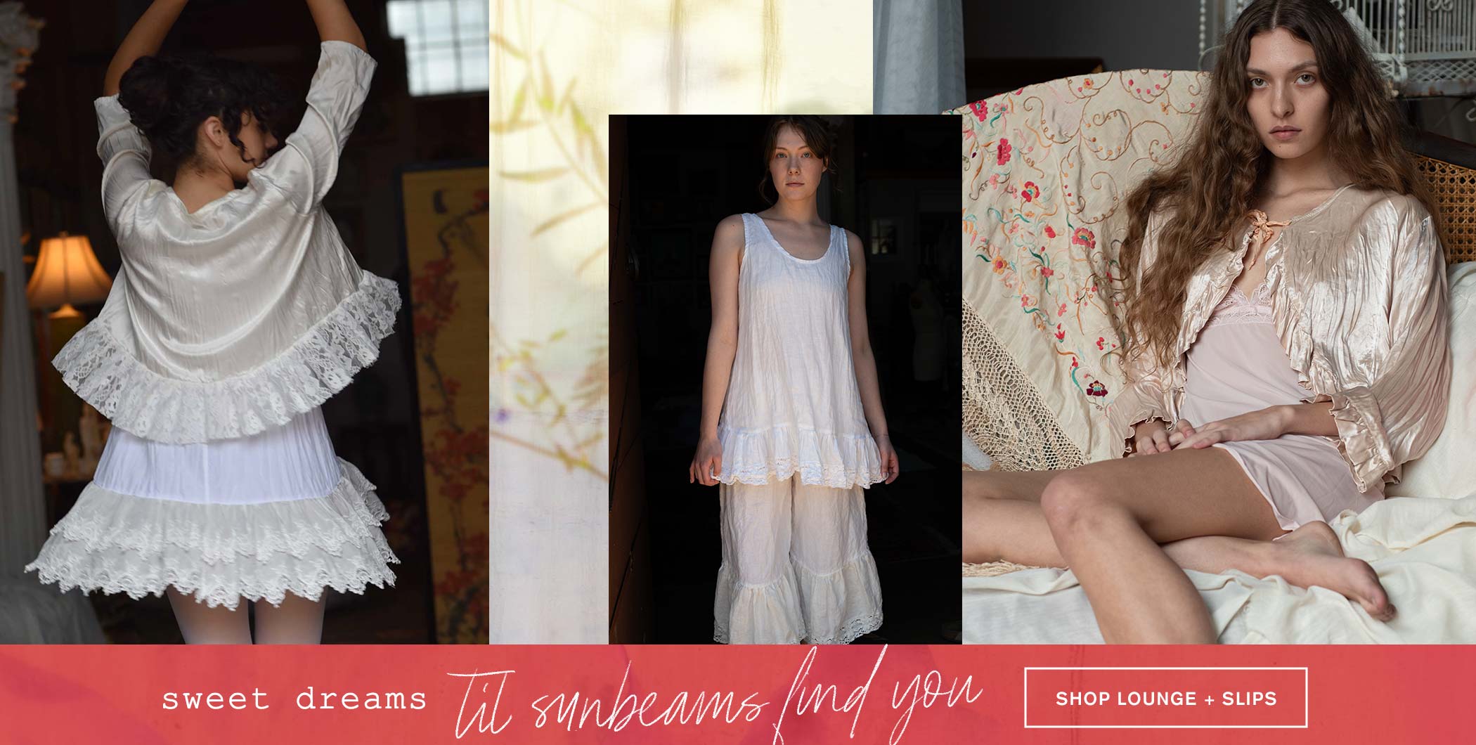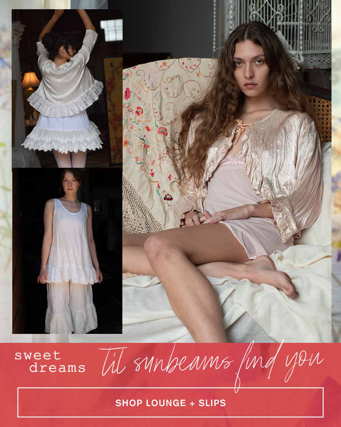 Romantic women's clothing — dresses, tops, skirts, bloomers, and more — that charm and inspire. Our unique linen and velvet clothing, from shabby chic tops to bohemian dresses or vintage-inspired slips, are sure to delight. Discover our collection of linen, velvet, and seersucker women's clothing. Looking for something special? Try browsing our embroidered blouses, dresses with sleeves, women's under slips, lagenlook linen dresses, or linen clothing.