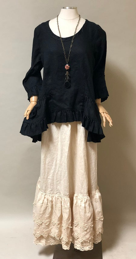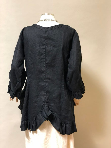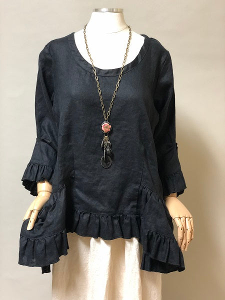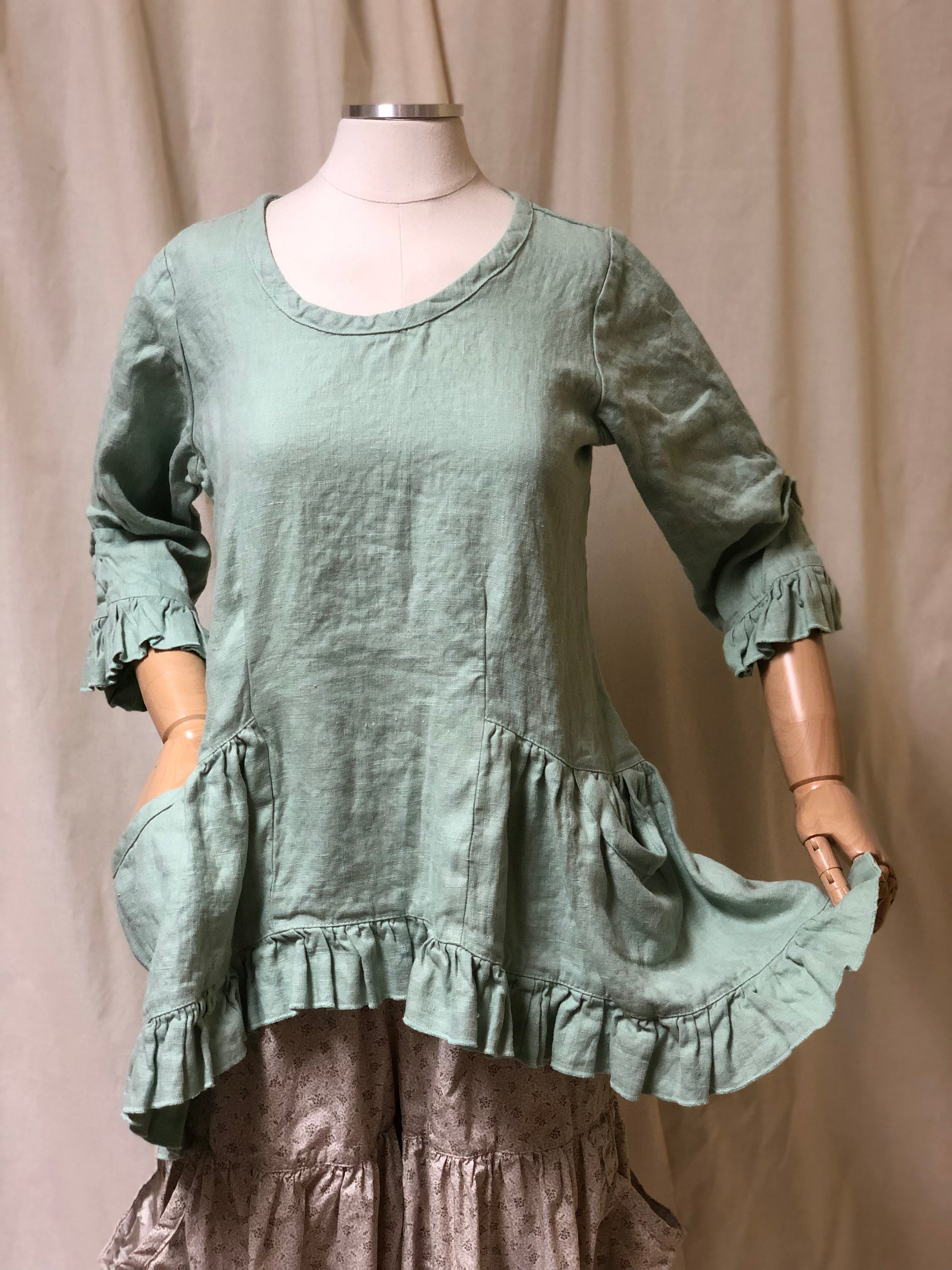 Very flattering top 3/4 sleeves with ruffle and tuck detail on arms, vintage styling little side pockets asymmetrical hem line gives this top a very flattering fit.