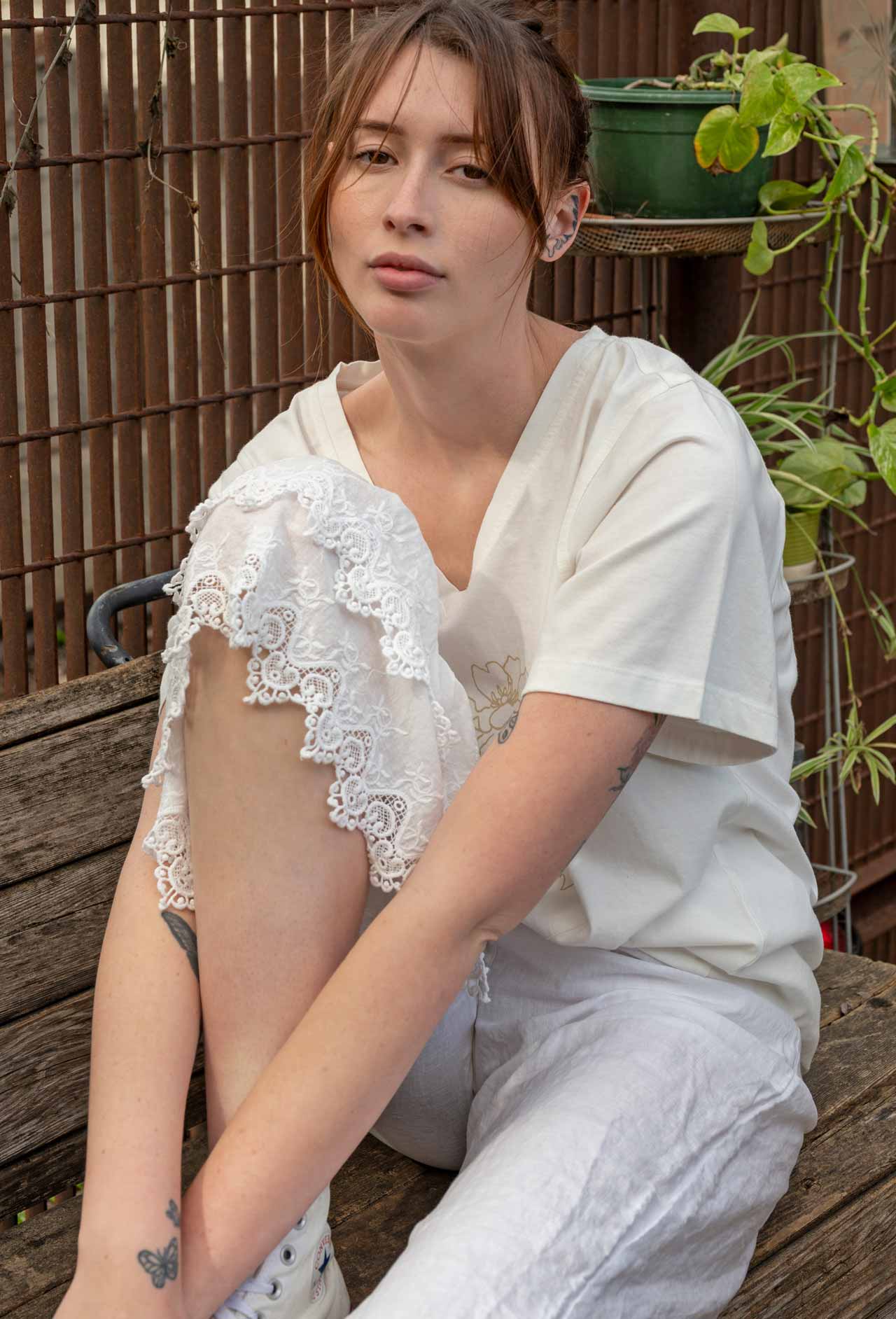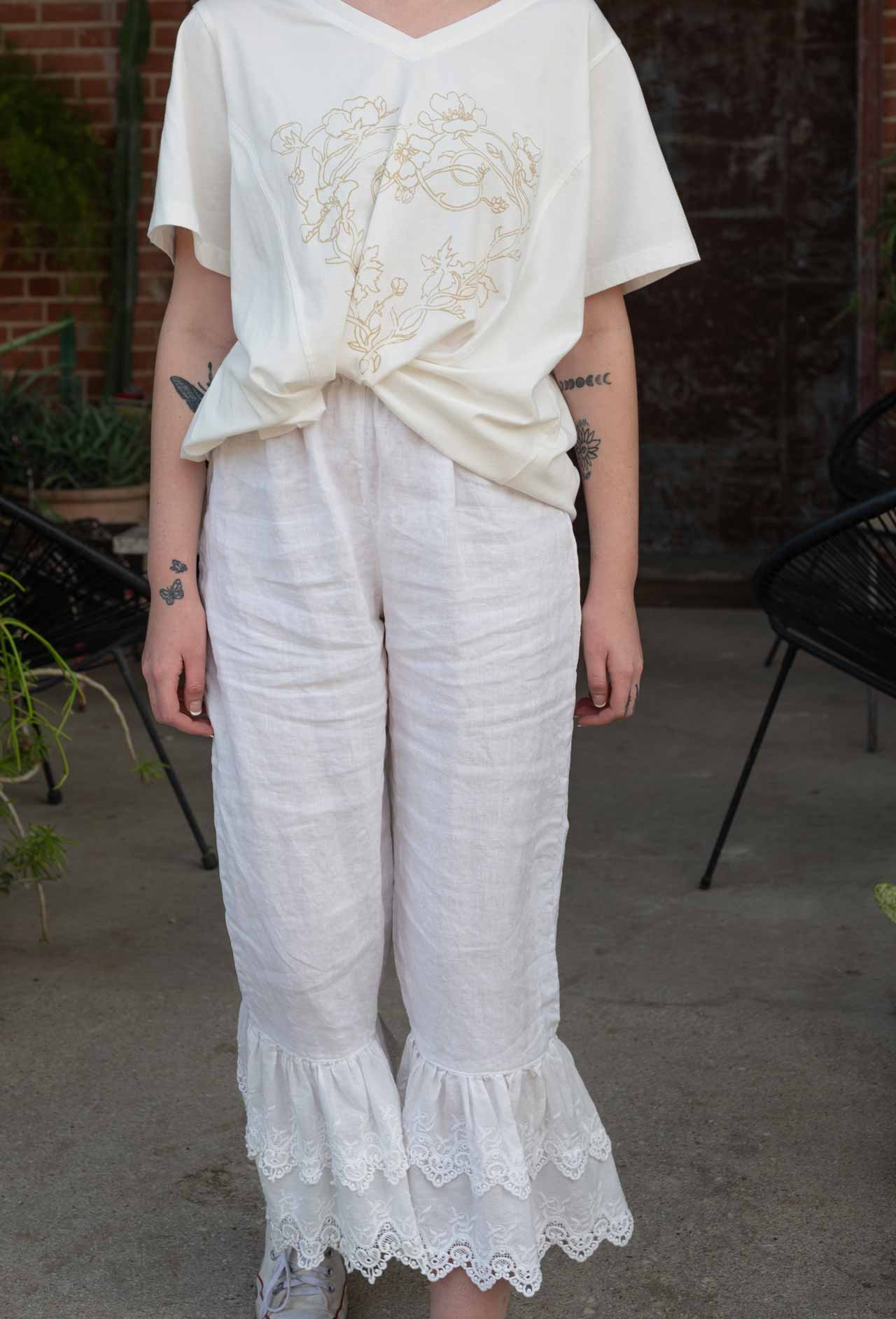 Be the perfect poem in these adorable pantaloons! Made from hankie linen with a cotton double ruffle lace, they are timeless, classic, and oh so vintage. Perfect for lounging, these pants will have you feeling poetic all day long. Comfortable elastic waist, made in USA