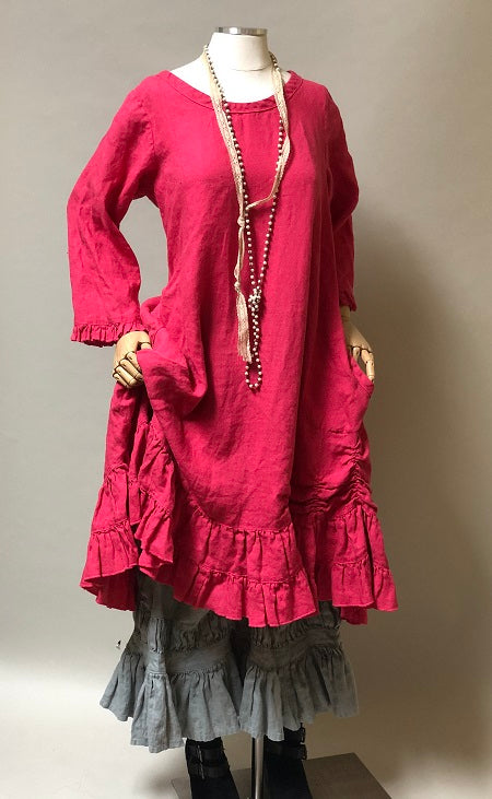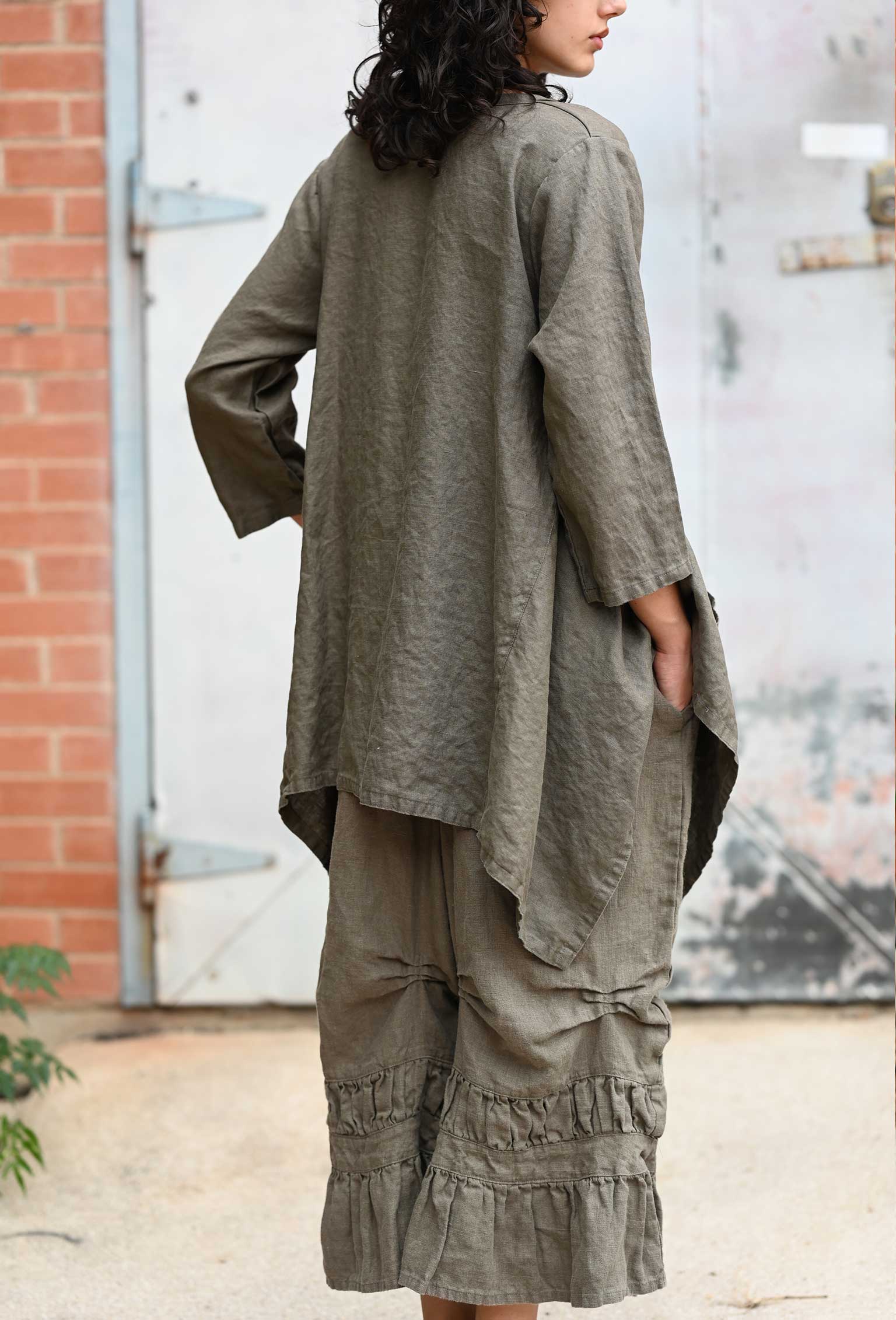 These ruffled wide leg linen pants combine our favorite antique sewing techniques to create a whimsical silhouette. Features comfortable elastic waist, deep flat pockets, multiple ruching styles and swing ruffles at hem. Made in the USA.