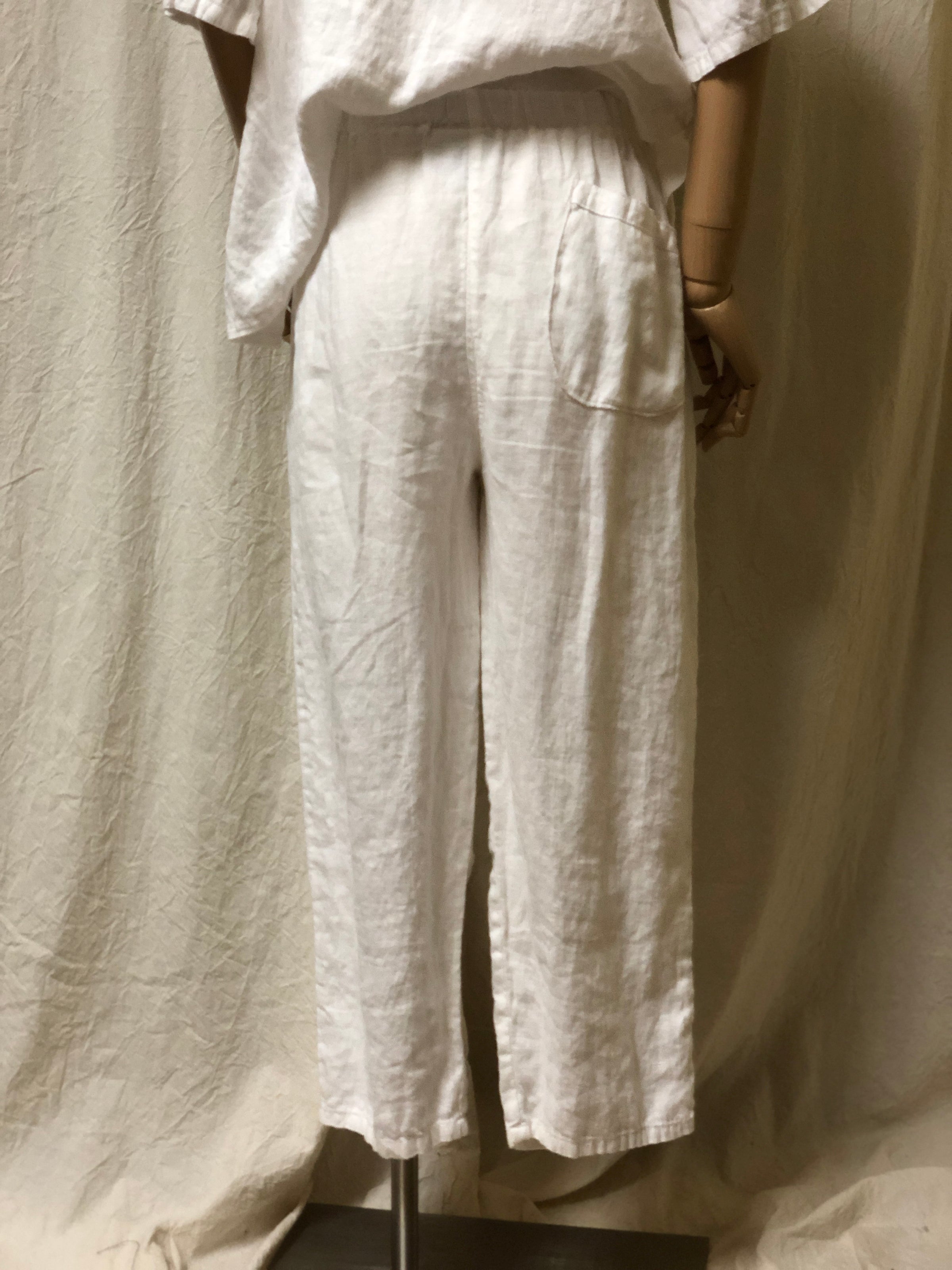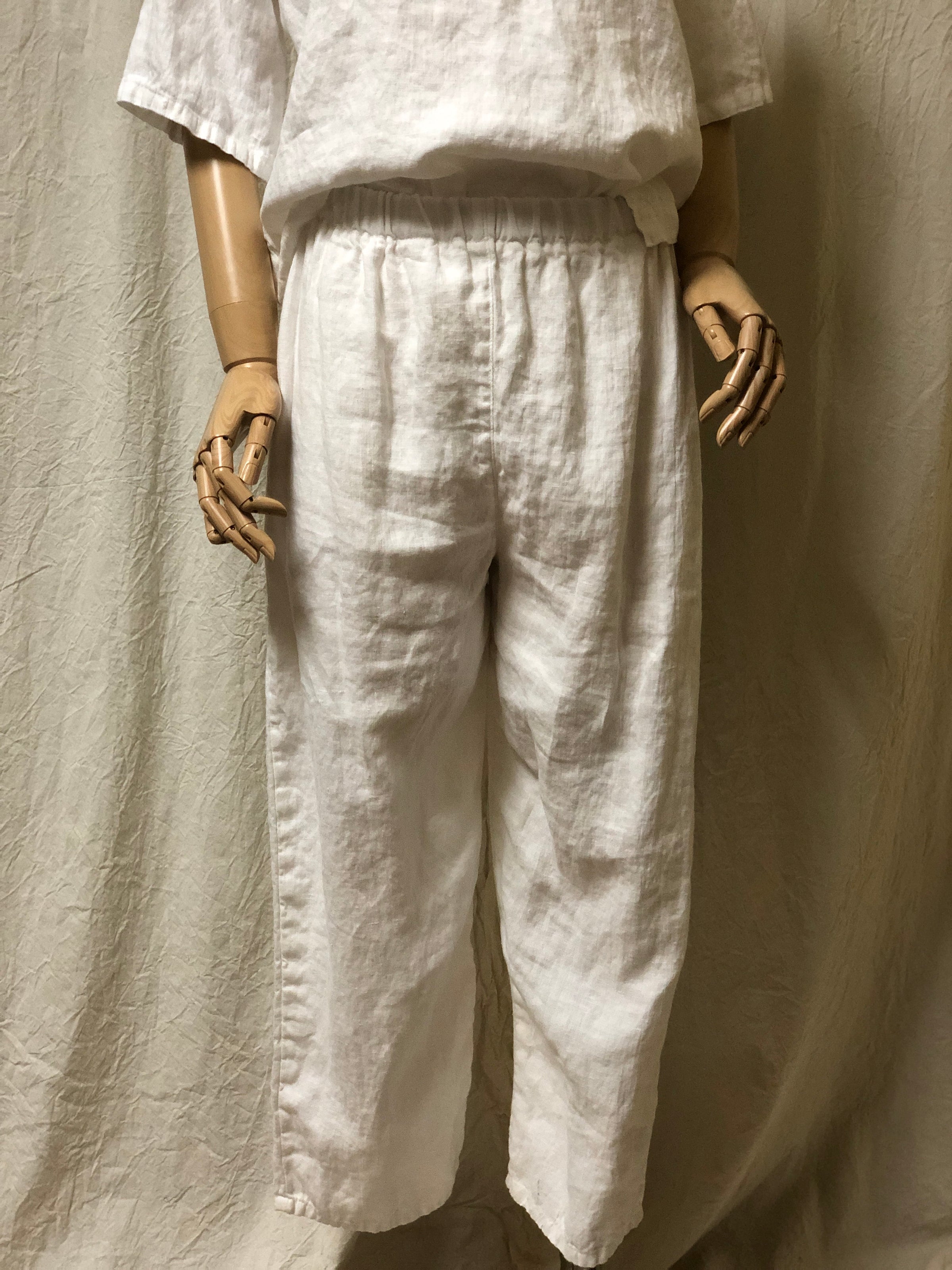 Playful linen pants. Cropped cut hits around calf. Features side pockets and ruffle detail. Elastic waist for easy fit. These wide leg women's pants look amazing layered under a dress. Slightly shorter than our Janis Bloomer Long. Inseam 23" Made in the USA.