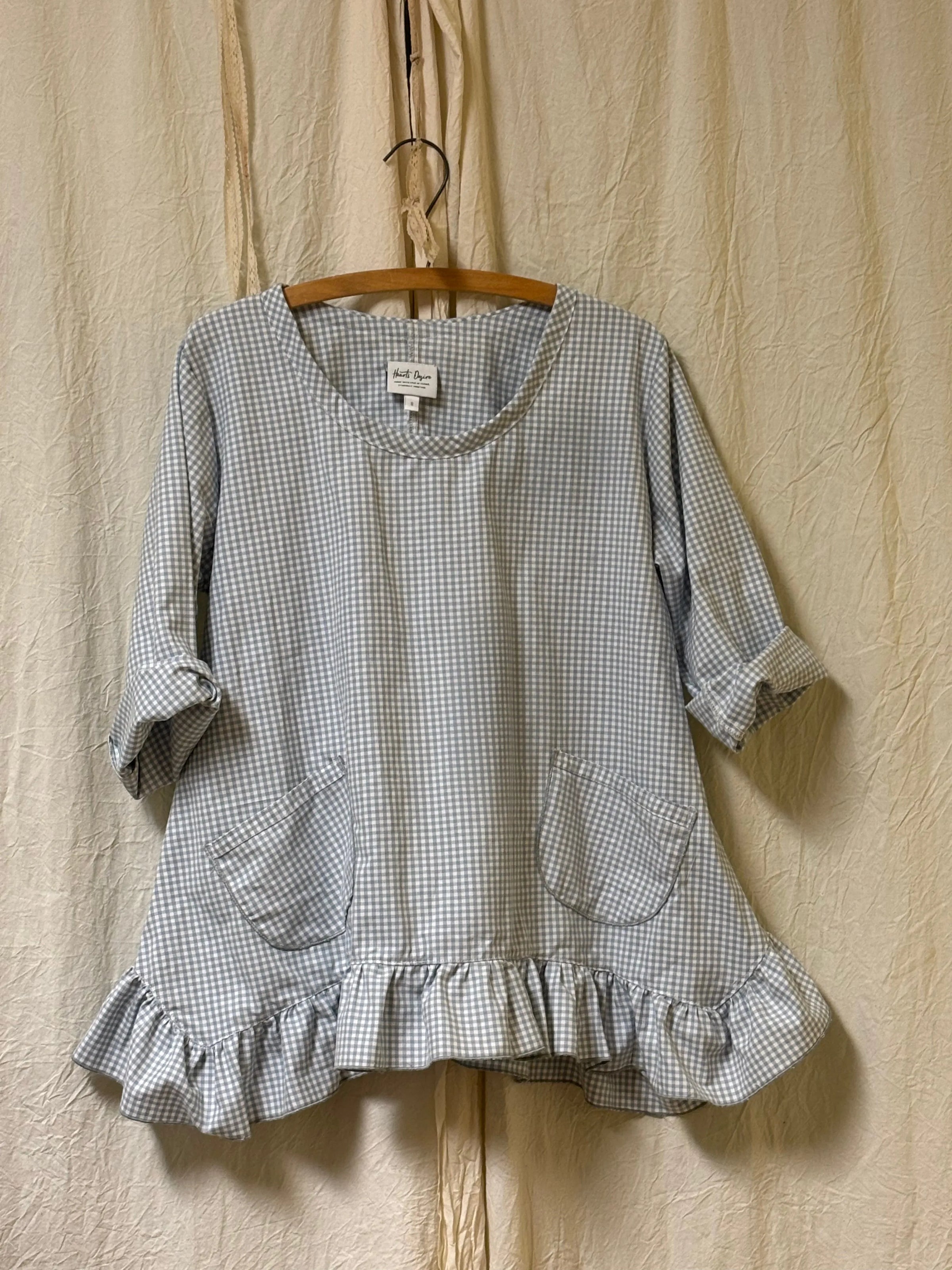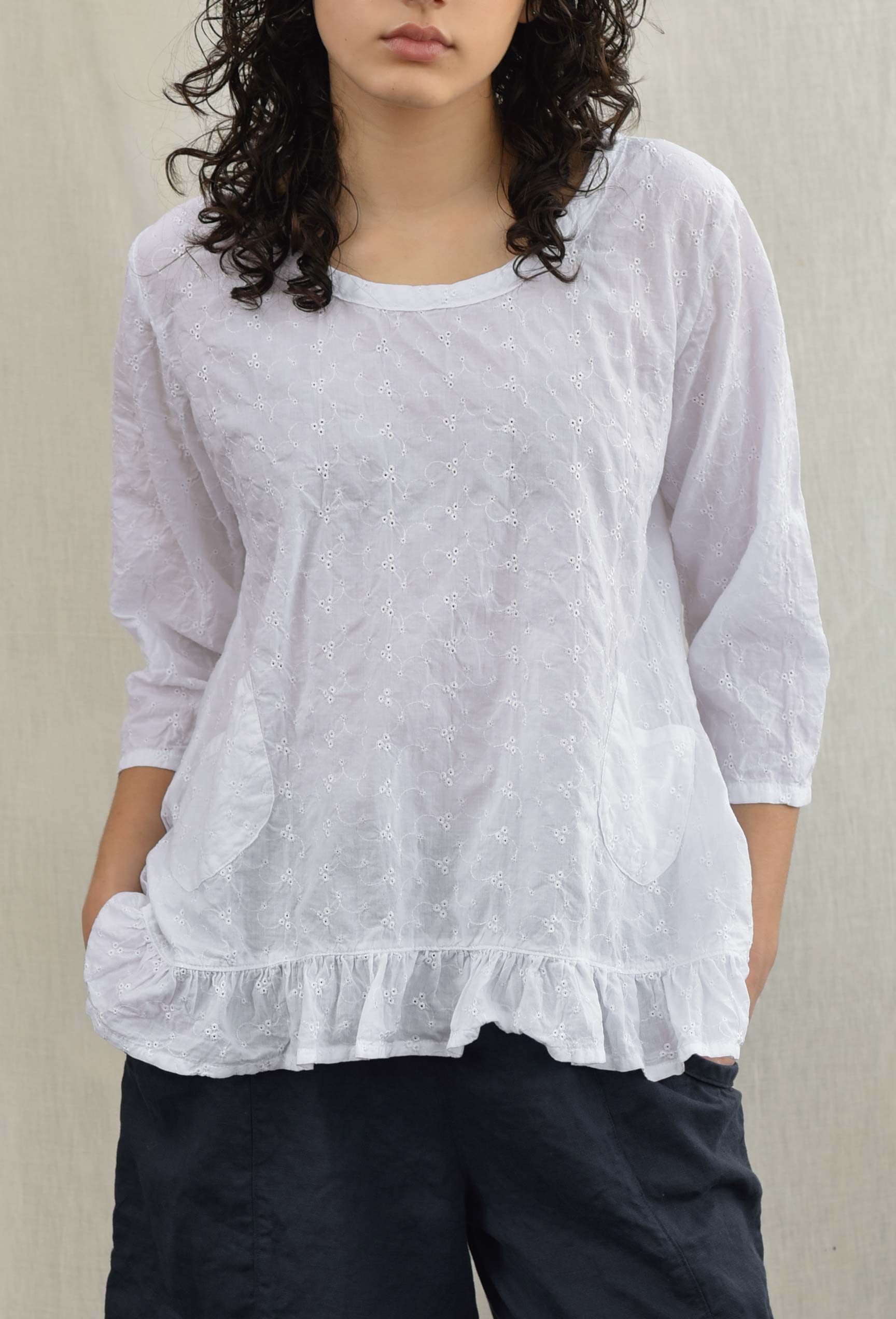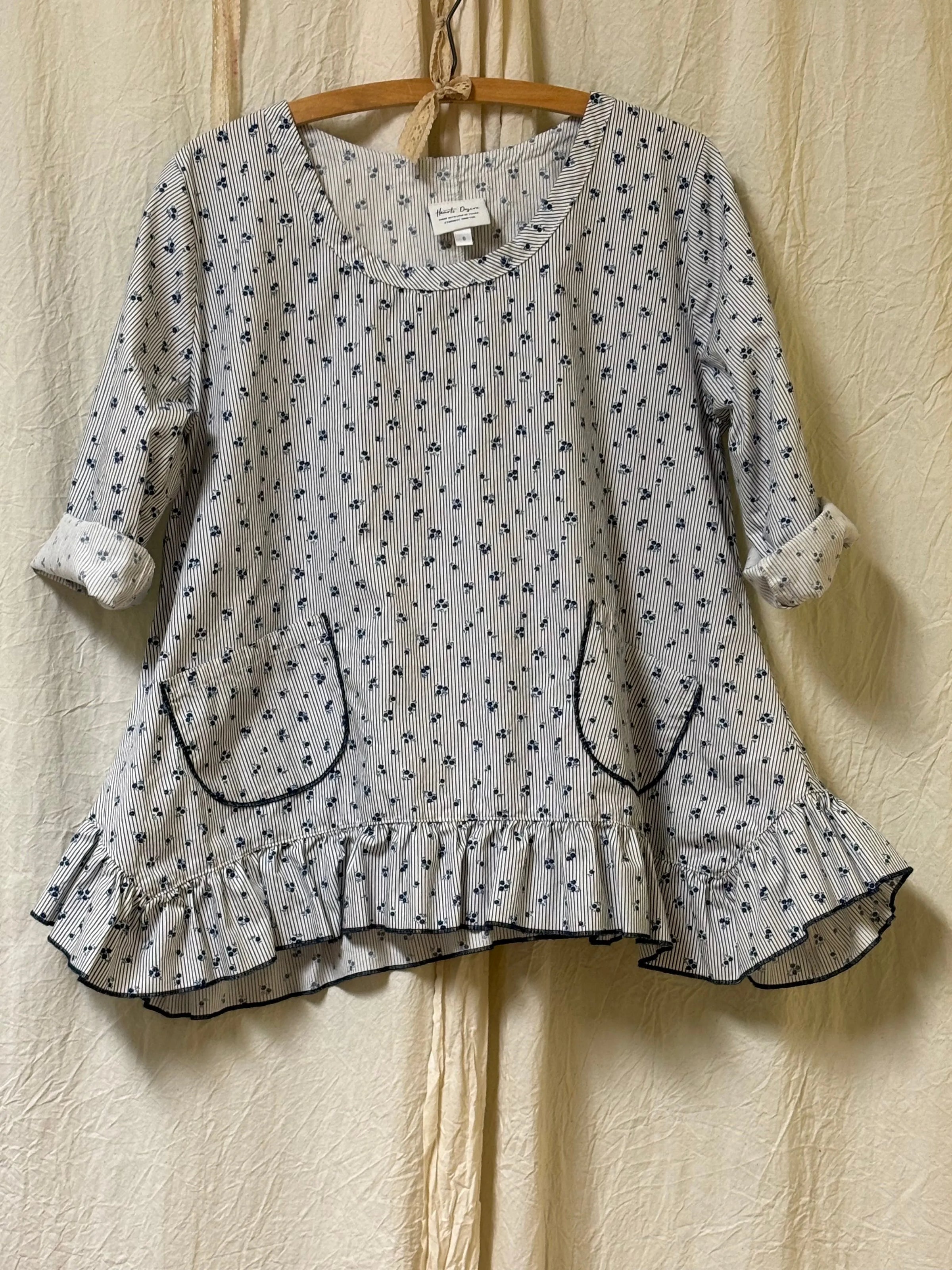 Flattering cotton  blouse featuring little patch pockets. Carefully sewn ruffle bottom makes this top perfect for carefree summer days. Sewn in USA
