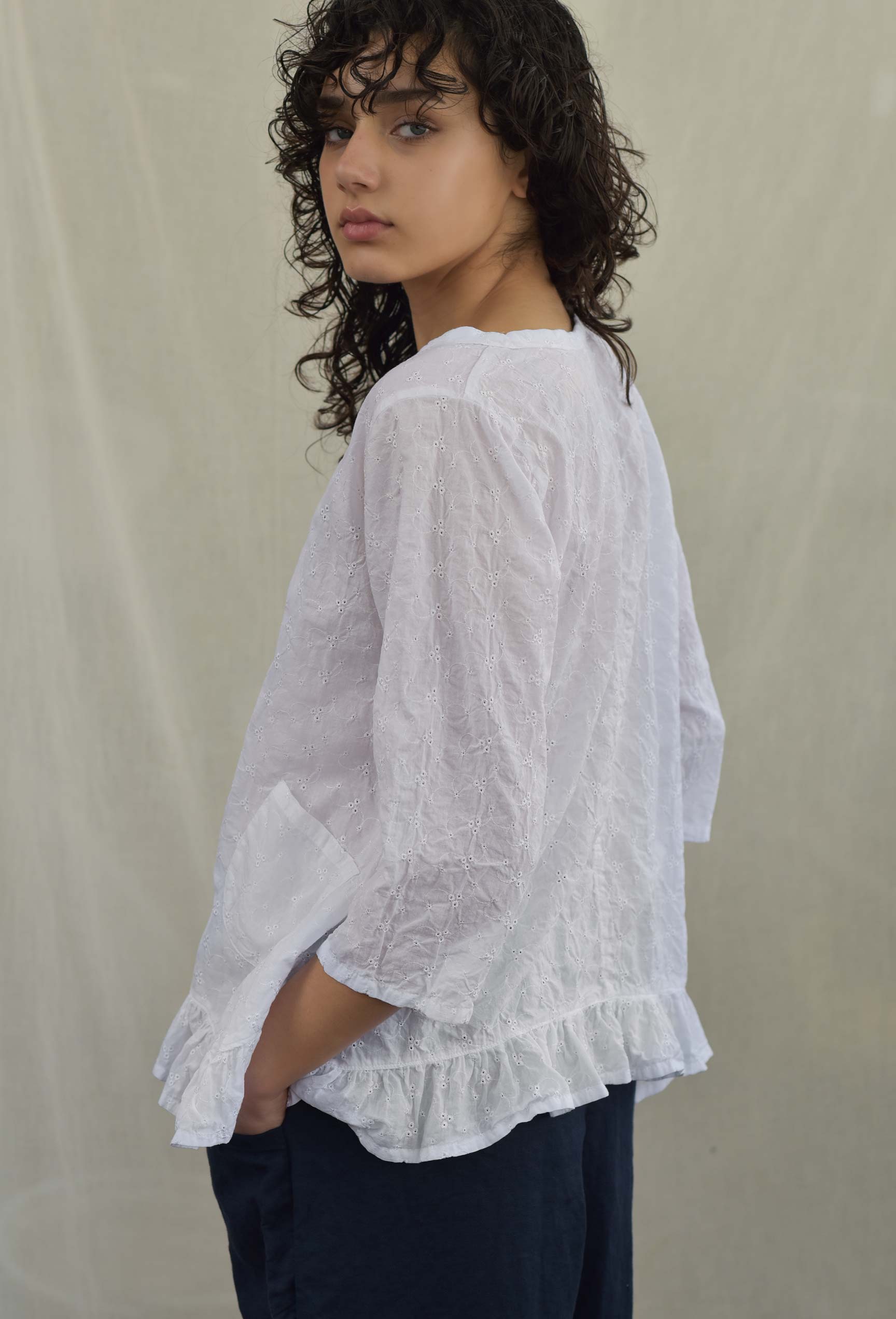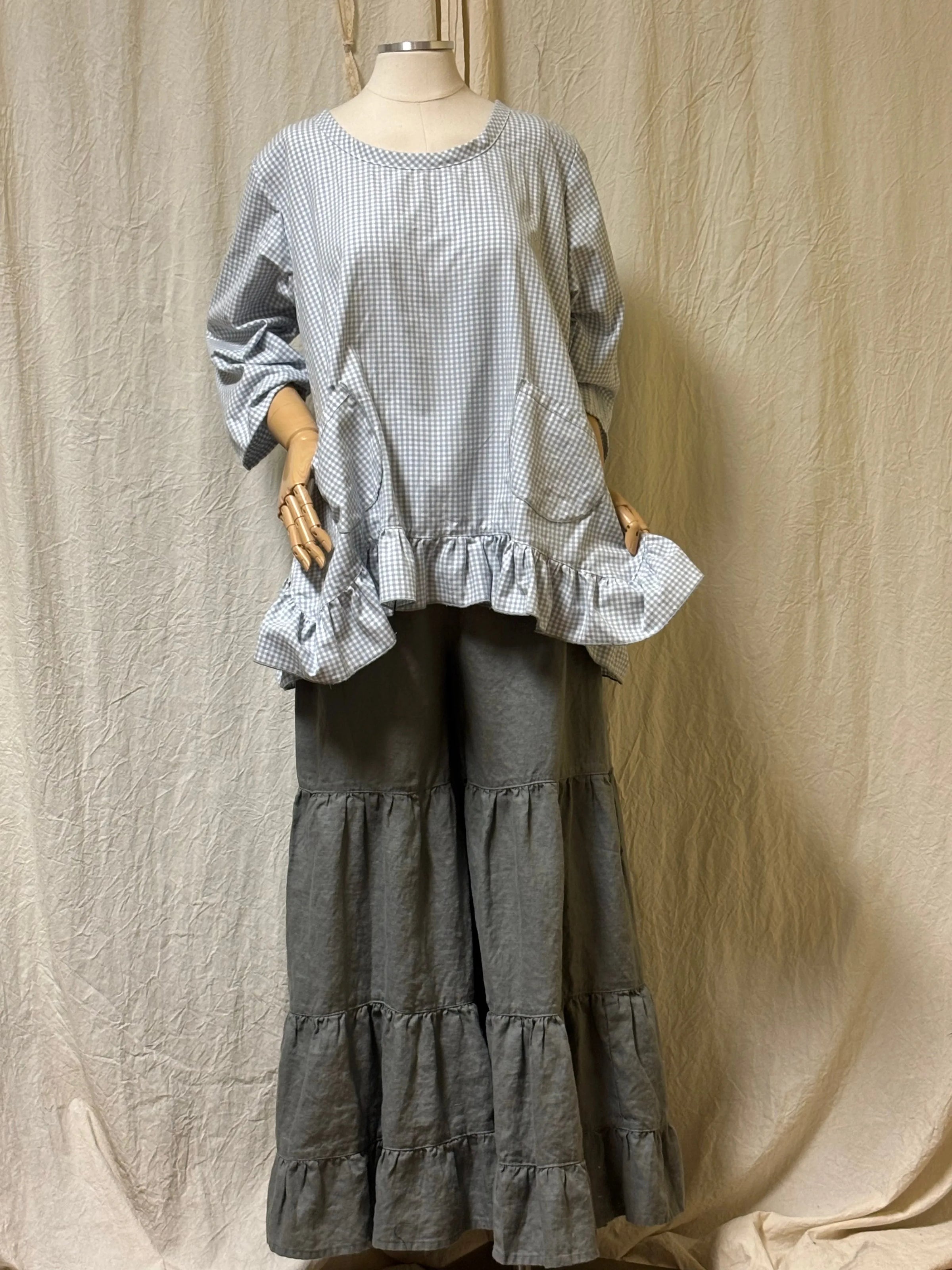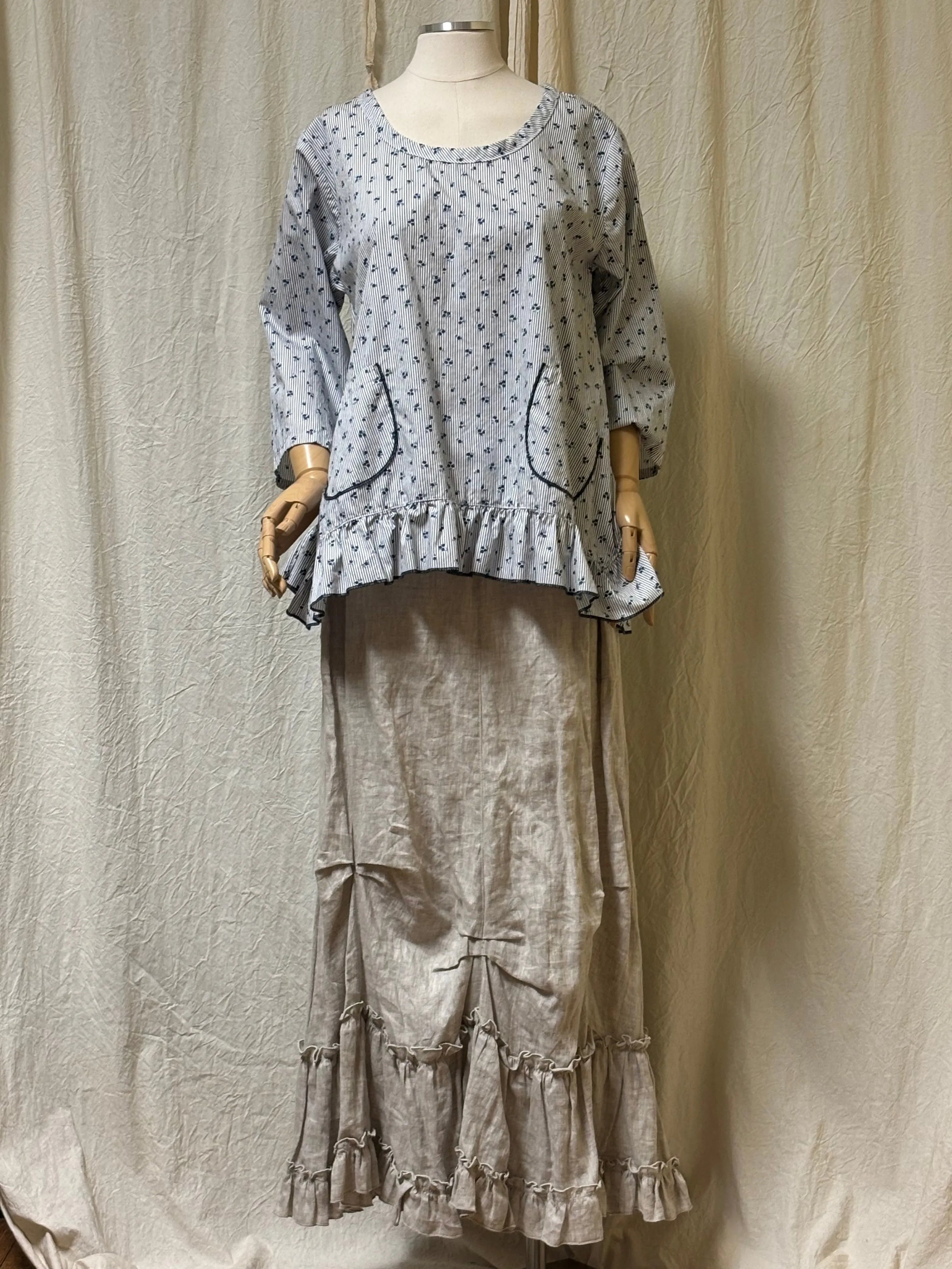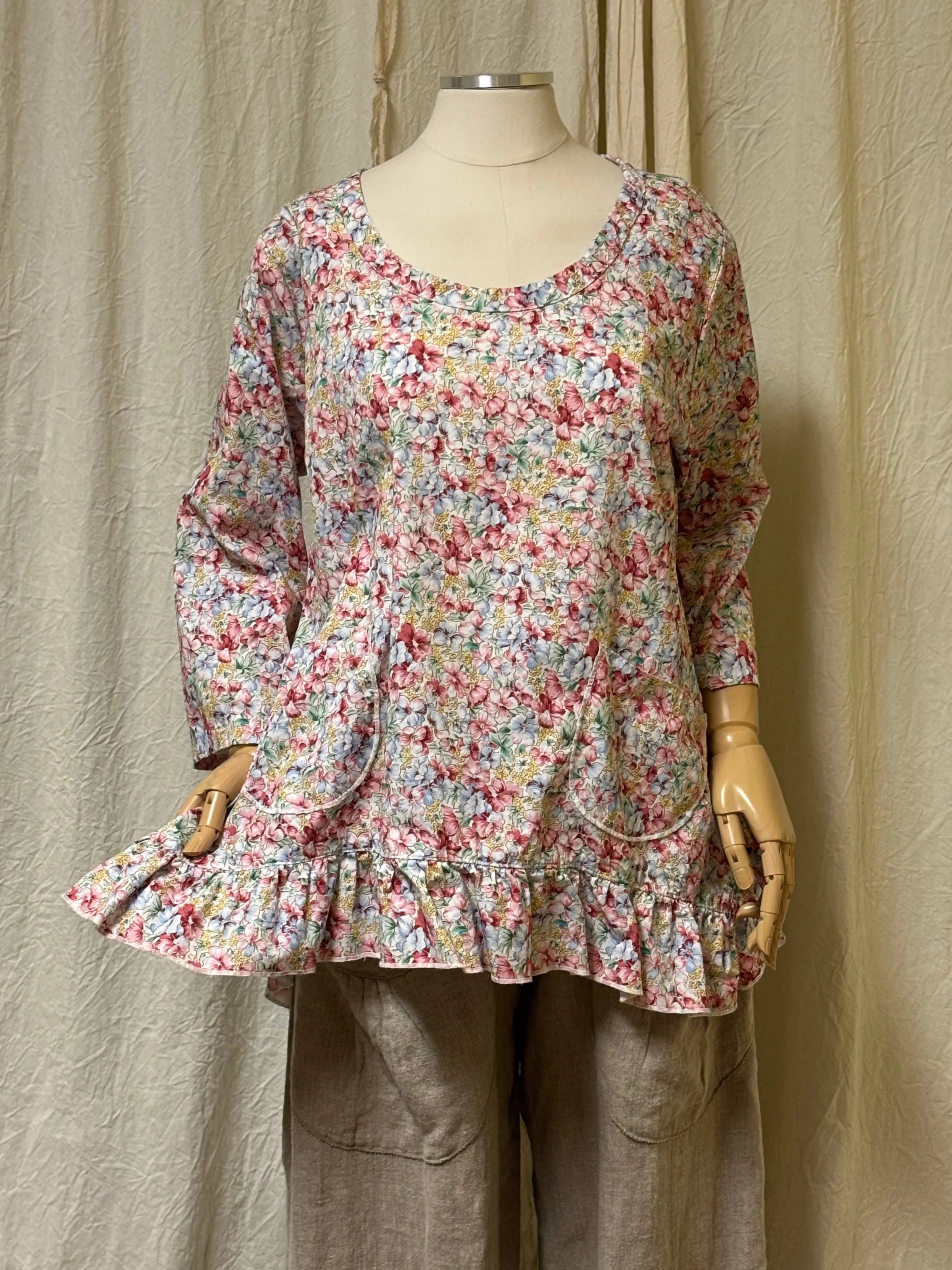 Flattering cotton  blouse featuring little patch pockets. Carefully sewn ruffle bottom makes this top perfect for carefree summer days. Sewn in USA