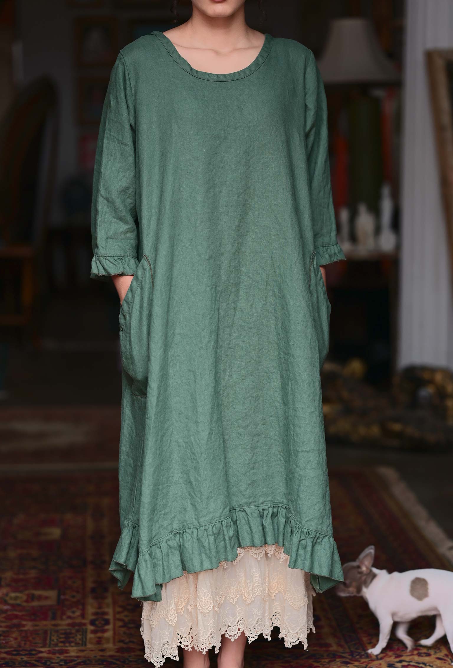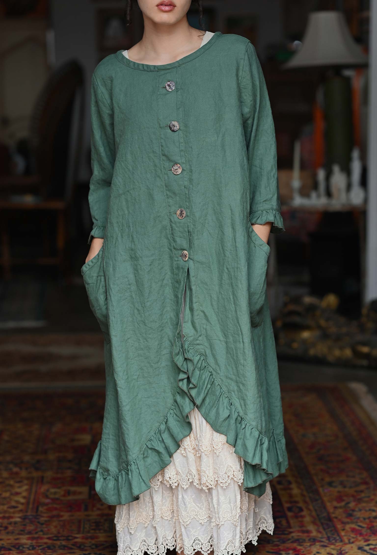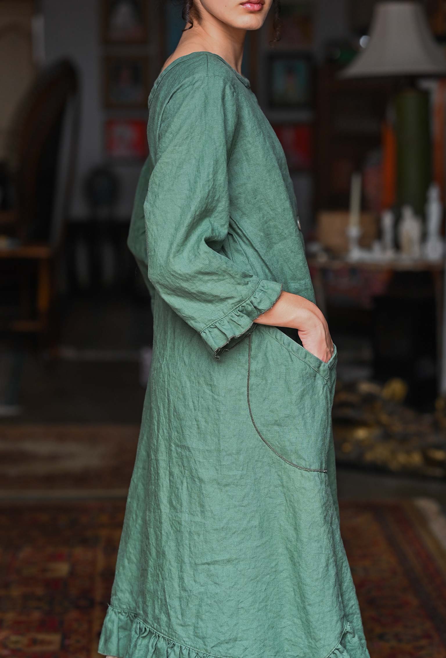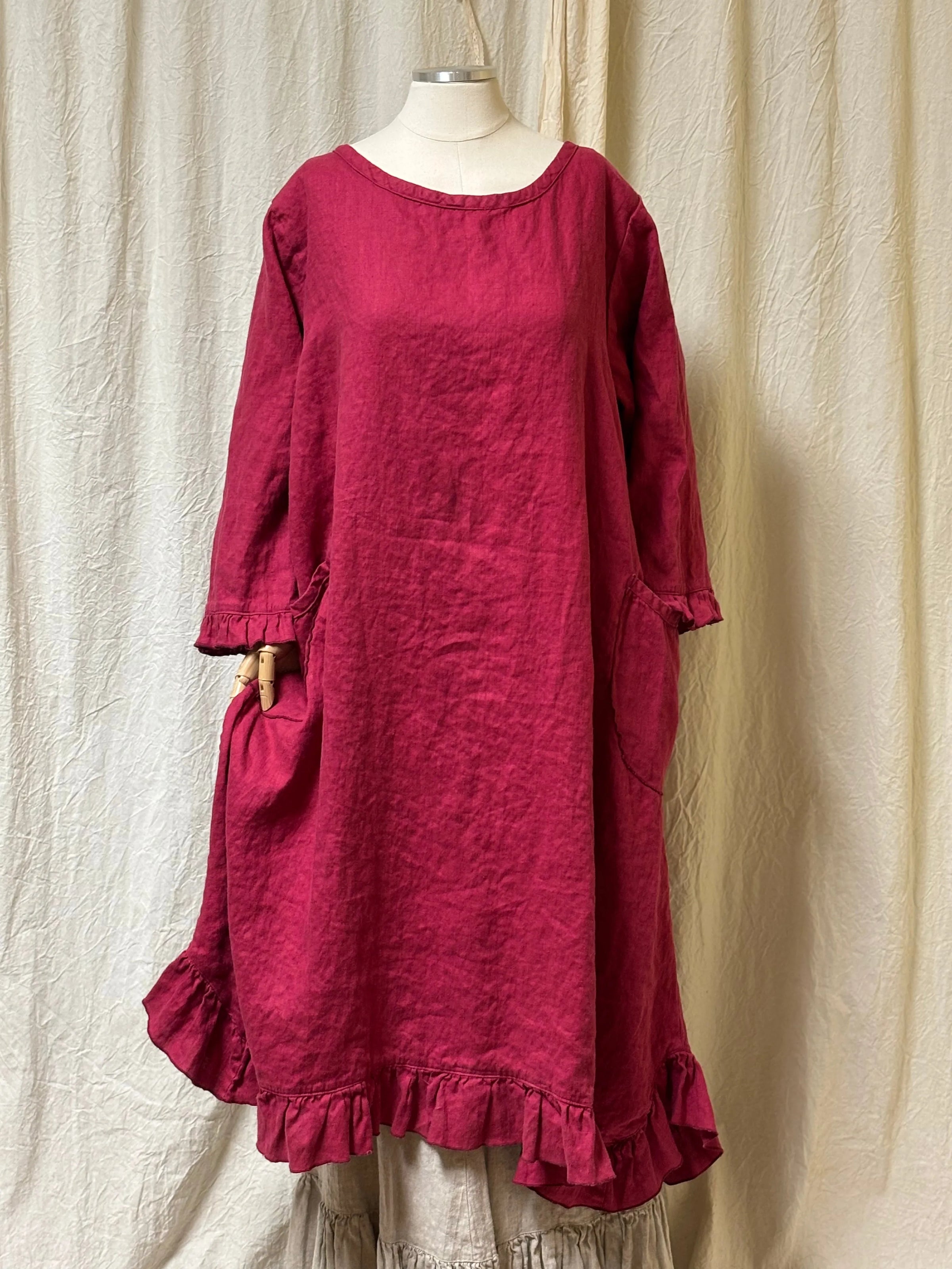 Experience the nostalgia of classic styling with the Alexandra Over Smock Linen. This versatile piece can be worn with buttons in the front or back, and features convenient side pockets and a charming ruffle hem. Layer it over a slip or pair with leggings, jeans, or your favorite skirt for a beautifully comfortable look. Shown with the Clair Slip. Made in USA