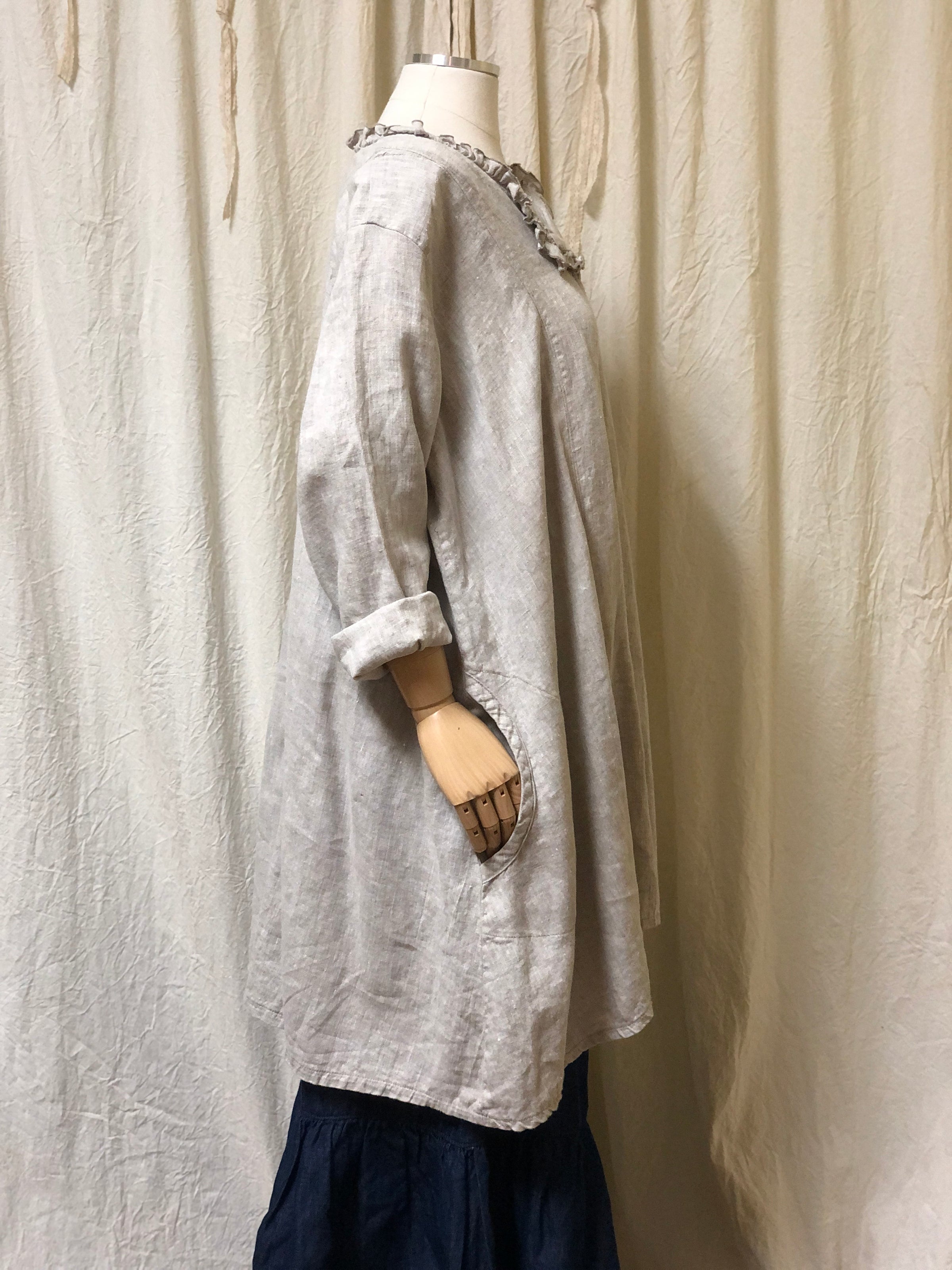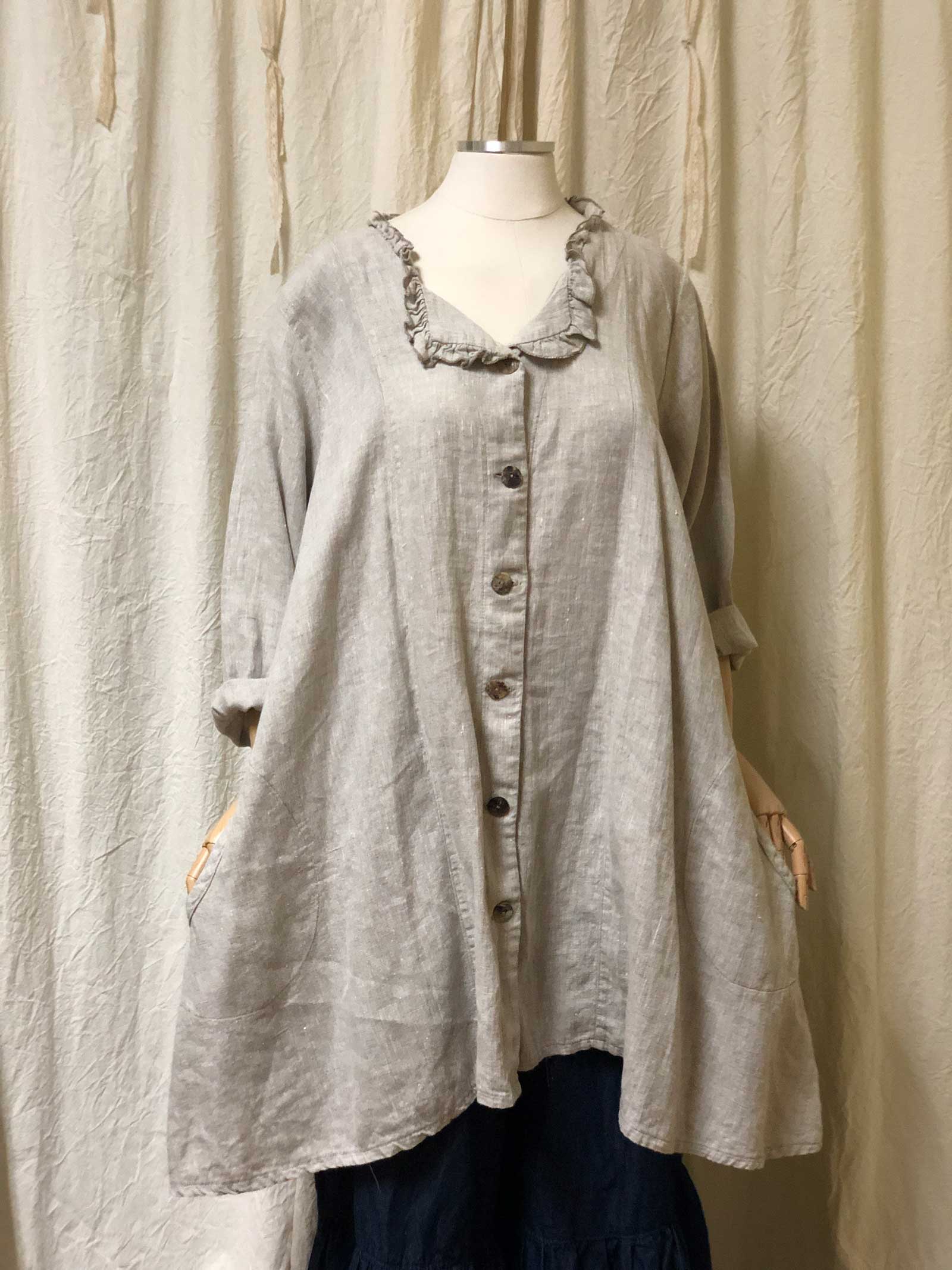 Long swing top with side pockets shell button front ruffle edge faux collar, a very easy comfortable yet stylish wear, can also be worn as a jacket. So adorable with crop pants, leggings, or jeans, also stunning over one of our slips or skirts. The  princess seam lines make for a very flattering silhouette. A dream to wear. Made in USA