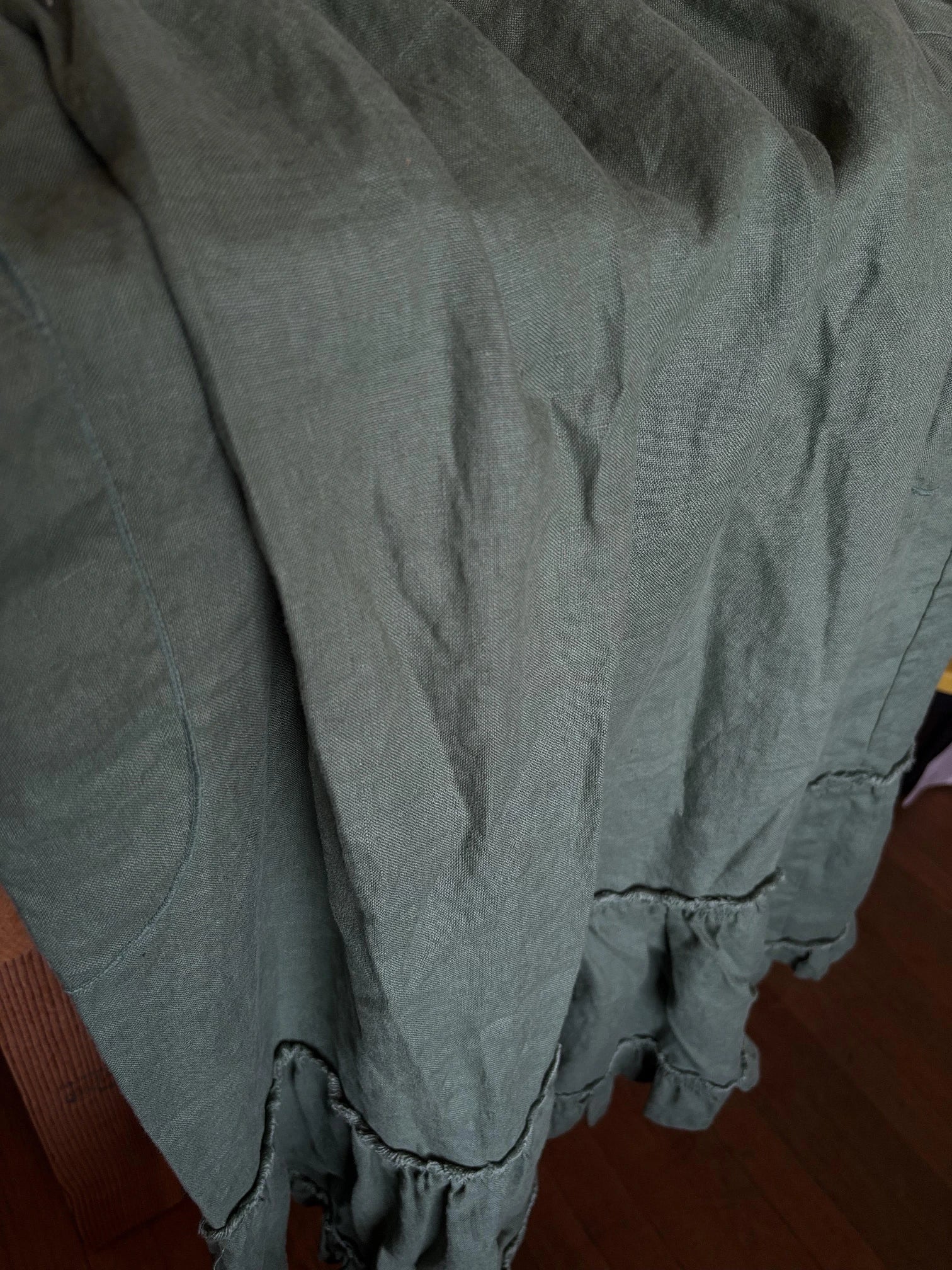 Prairie style linen dress, with big side pockets with tuck and shell button detail, great year-round wear. Dressed up or down a timeless style. The raw edge ruffles make for a very vintage boho look. Made in USA.