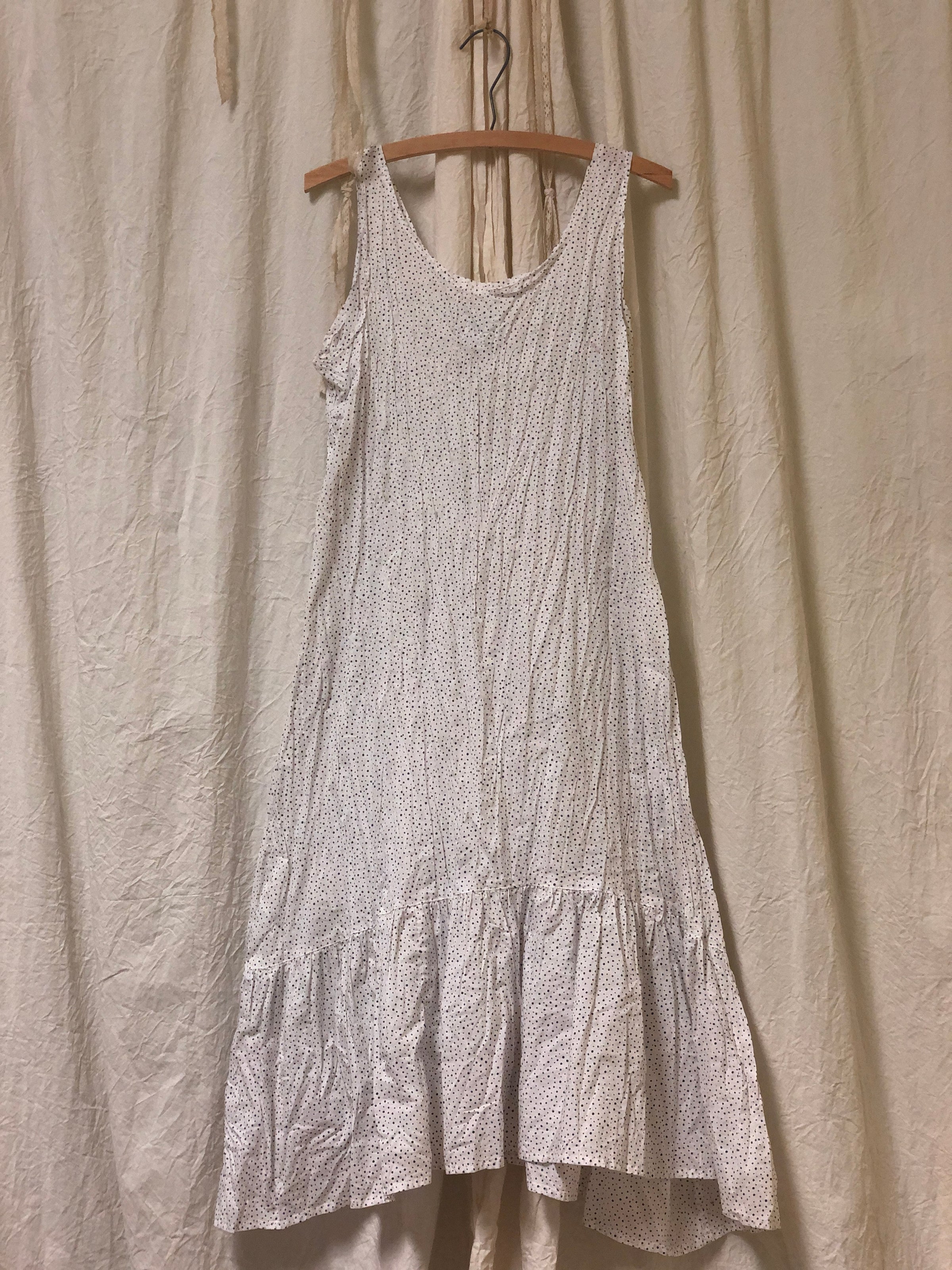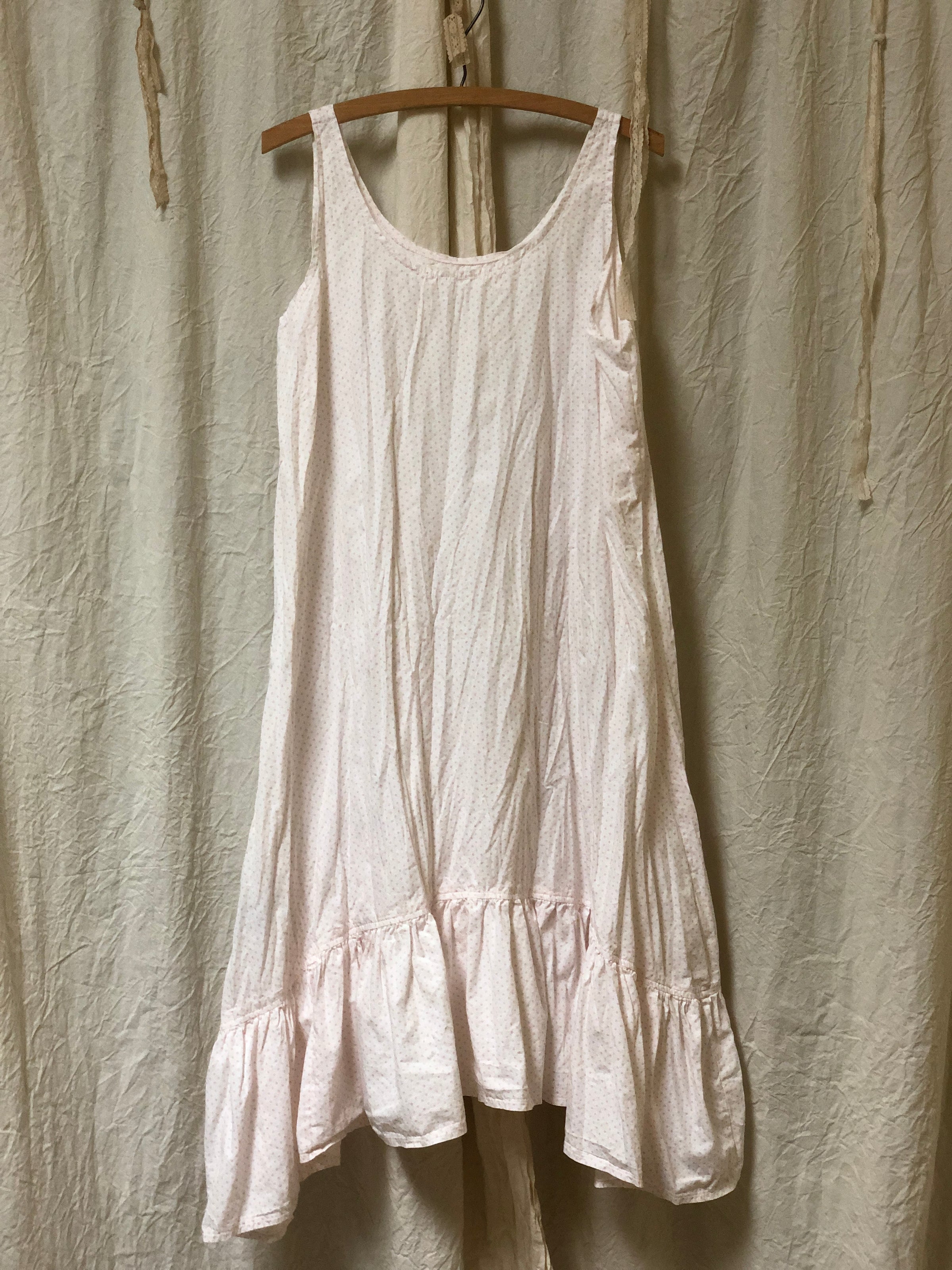 Our Nicole Slip in a wonderful cotton chambray. This cotton is durable yet soft, opaque enough to wear on its own. Gracefully dips on the sides. A must-have layering piece or great as a slip dress. Shown with the Cora Top in Daisy  Embroidered cotton.