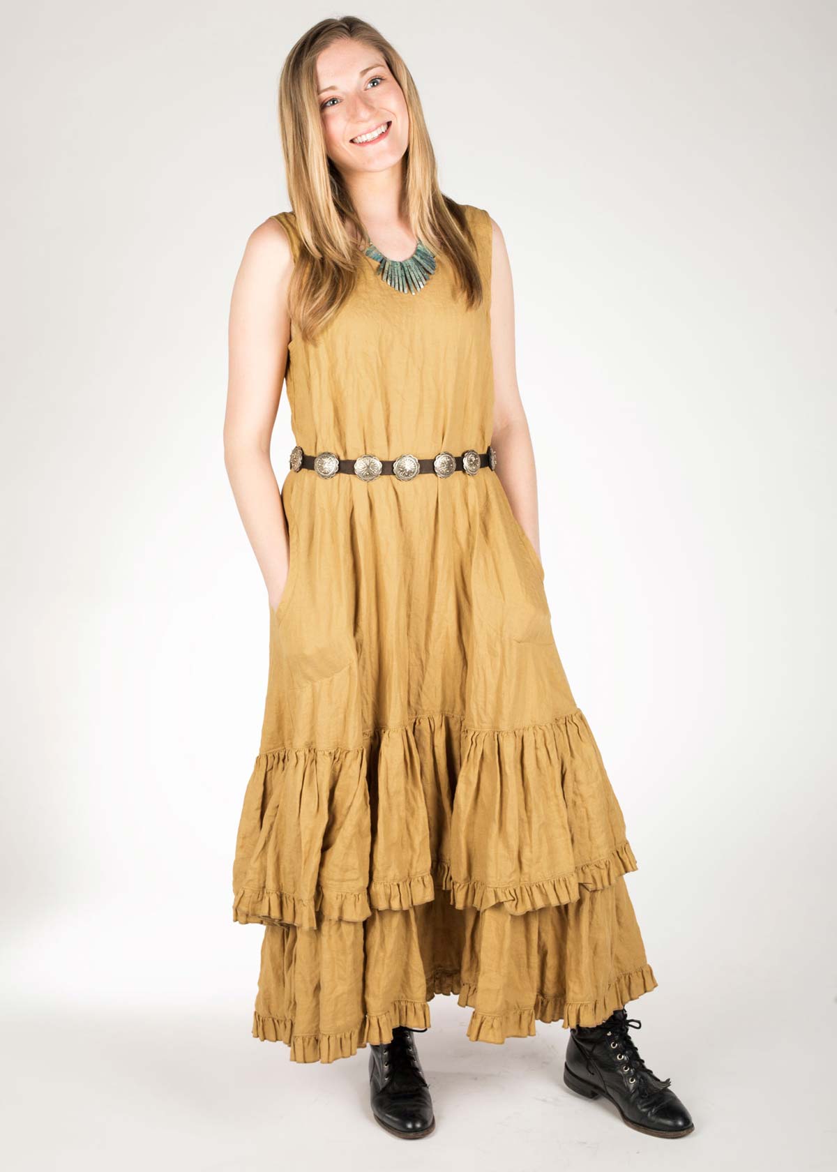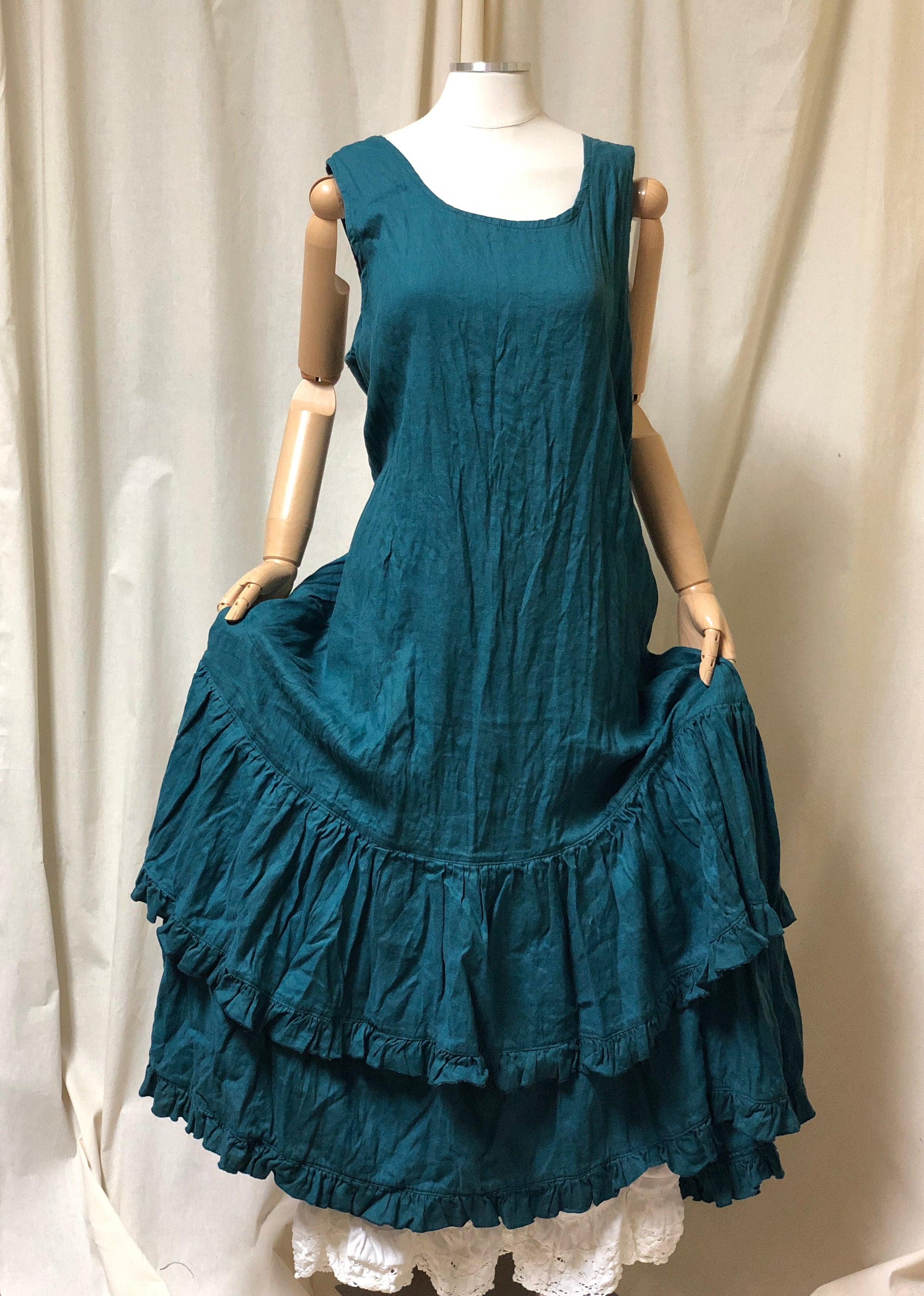 Stunning cottage core linen slip dress with tank sleeves and roomy pockets. High quality natural linen. Beautiful alone, but can be styled with a belt for a more fitted look. Layer it under a dress for added feminine frill, Sage Teal shown with half Petal Slip and India Lace Ruffle Jacket. Made in the USA.