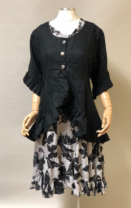 This linen jacket channels Victorian vibes with charming touches like a cascading waterfall front, playful ruffle edges, and delicate shell buttons. Perfect for layering over anything and extra cute paired with jeans. The sweet tie-back adds a flattering finish to this delightful piece. Sewn in the USA.