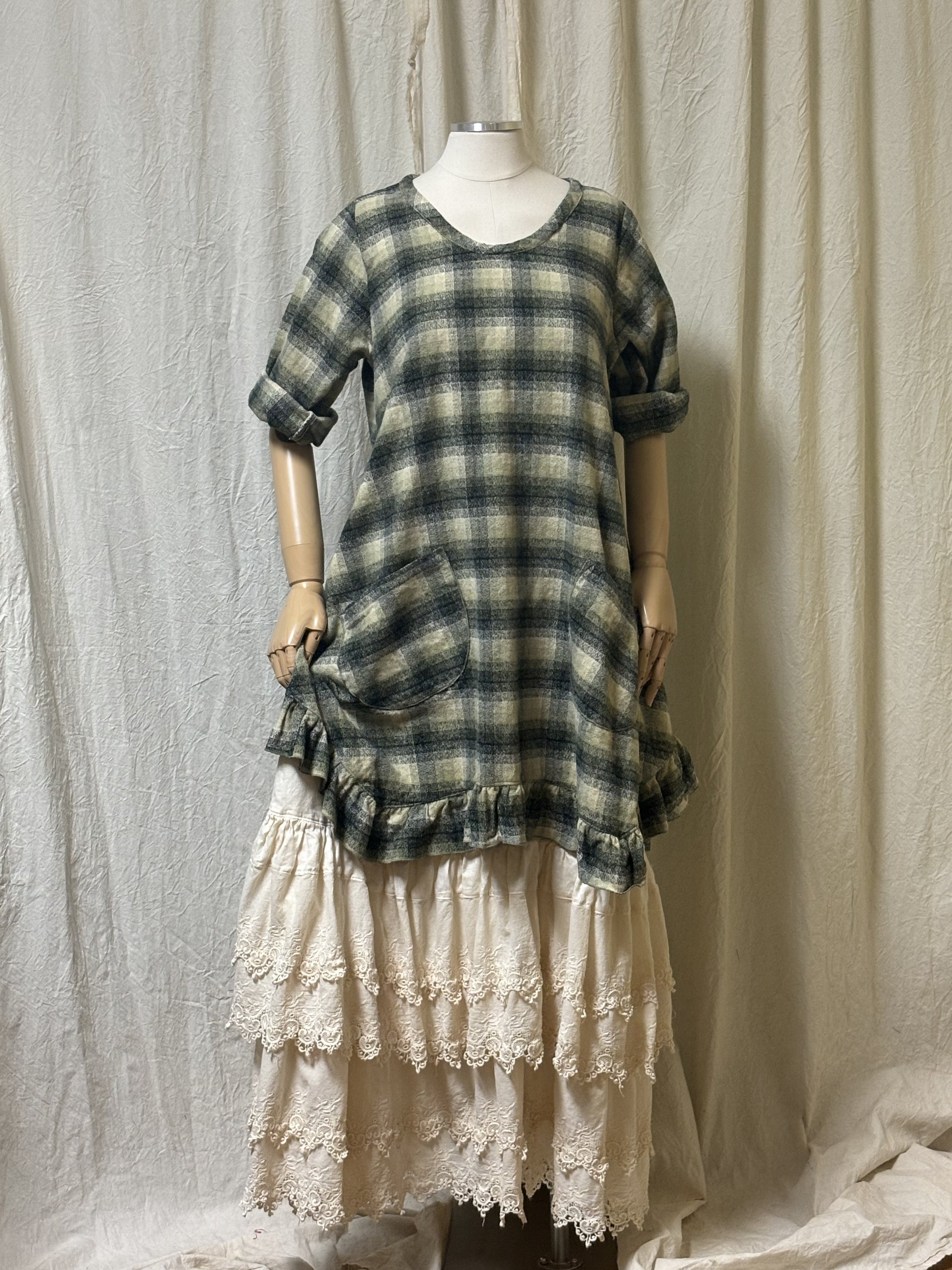 This top is so cozy you will want to wear it everyday when the weather turns chilly. This long high quality flannel top featuring scoop neckline, little patch  pockets, flairs on sides for a very flattering fit, and a playful ruffle hem. Looks great with our Nicole Slip or your favorite jeans or over our Victorian full slip or the Clair Slip. Made in the USA.