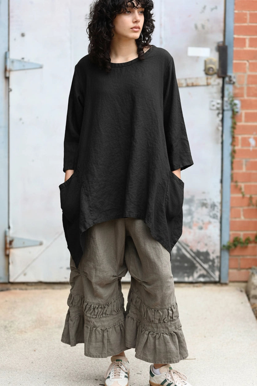 A simpler version of our classic Butterfly Top a bit longer, sans the ruffles in a airy light hankie linen, cute easy wear. Shown with Nicole Slip and Janis skirt sold separate.