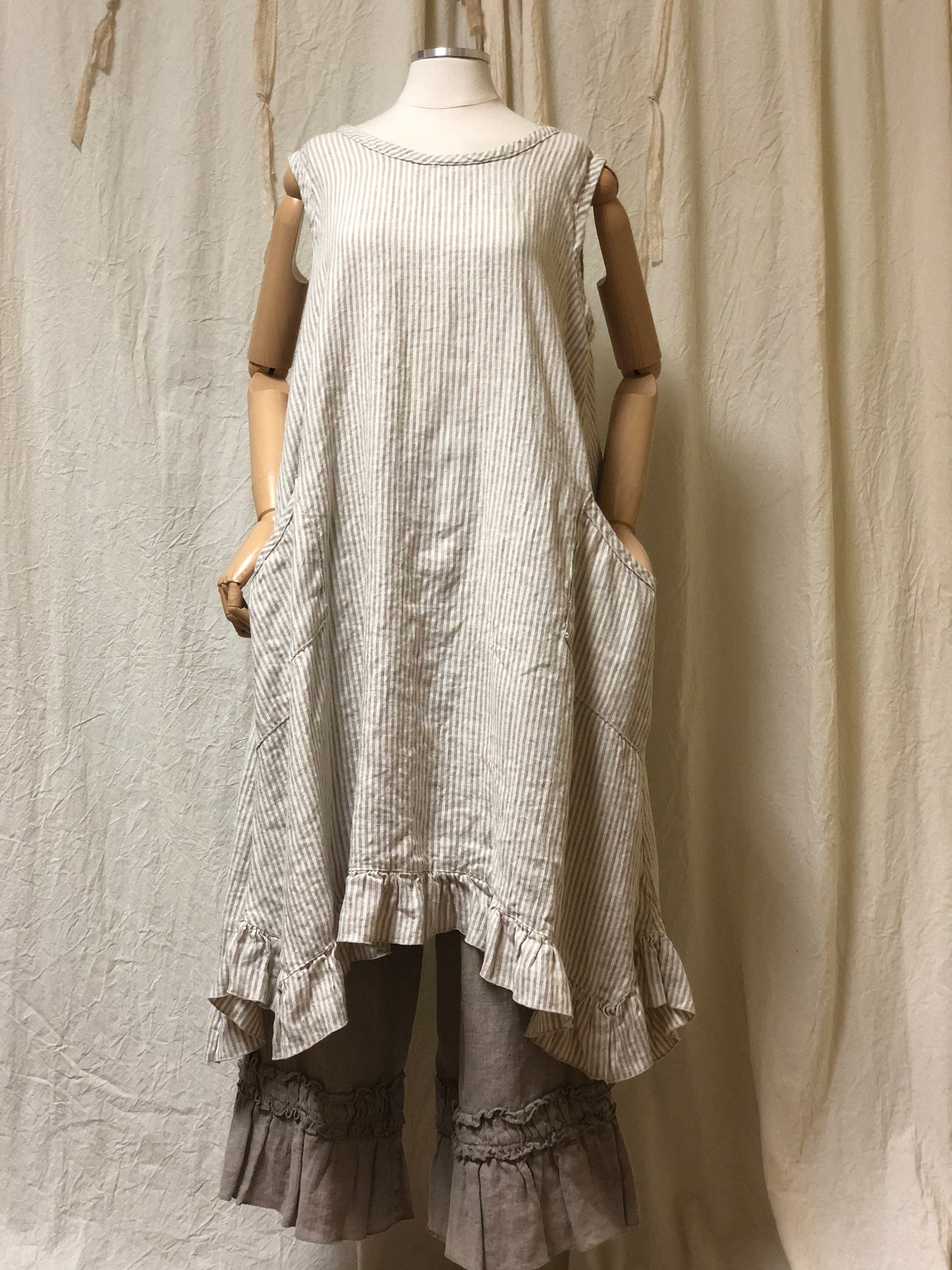Adorable button back smock style over dress features side pockets waterfall back with big shell buttons. Very nostalgic and timeless, room for under tee if desired, or cool and fresh on its own, beautiful over all you favorite slips and petticoats or over your favorite bloomers and pants. Tan stripe shown over the Sweet Pea pants.