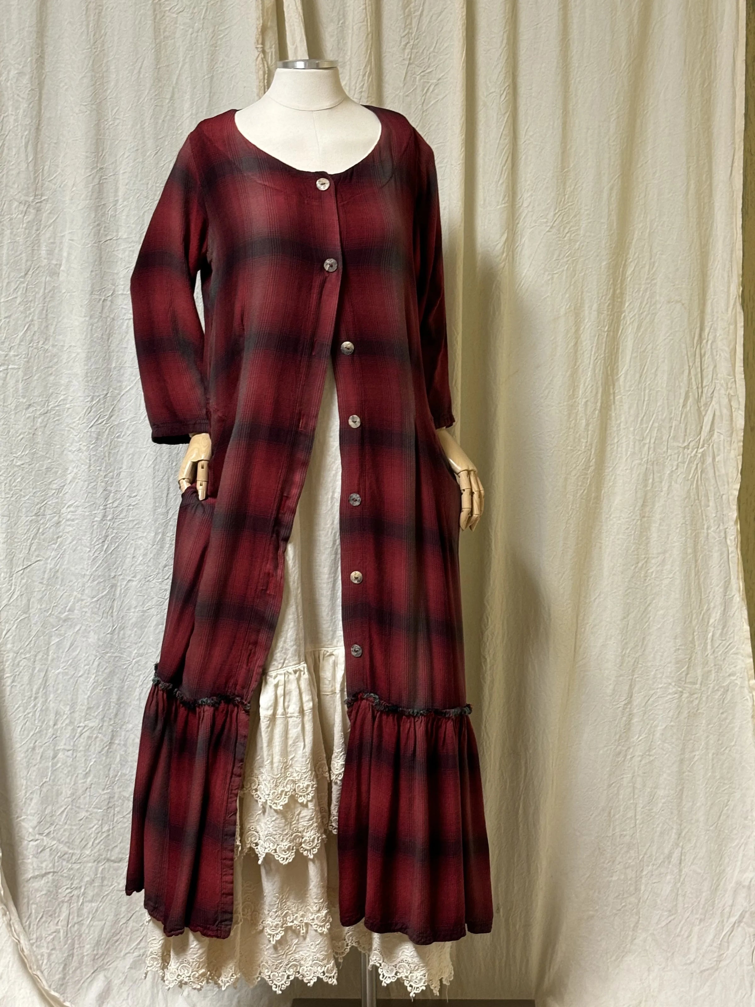 Elevate your style with our Mid Town Dress! Its vintage design and rayon twill fabric give it a beautiful drape and cozy feel. This versatile piece can be worn as a duster, over a dress, skirt and top, or even chic over jeans. Complete with shell buttons and side pockets, this dress is a dream to wear. Made in USA. Perfect for any occasion!