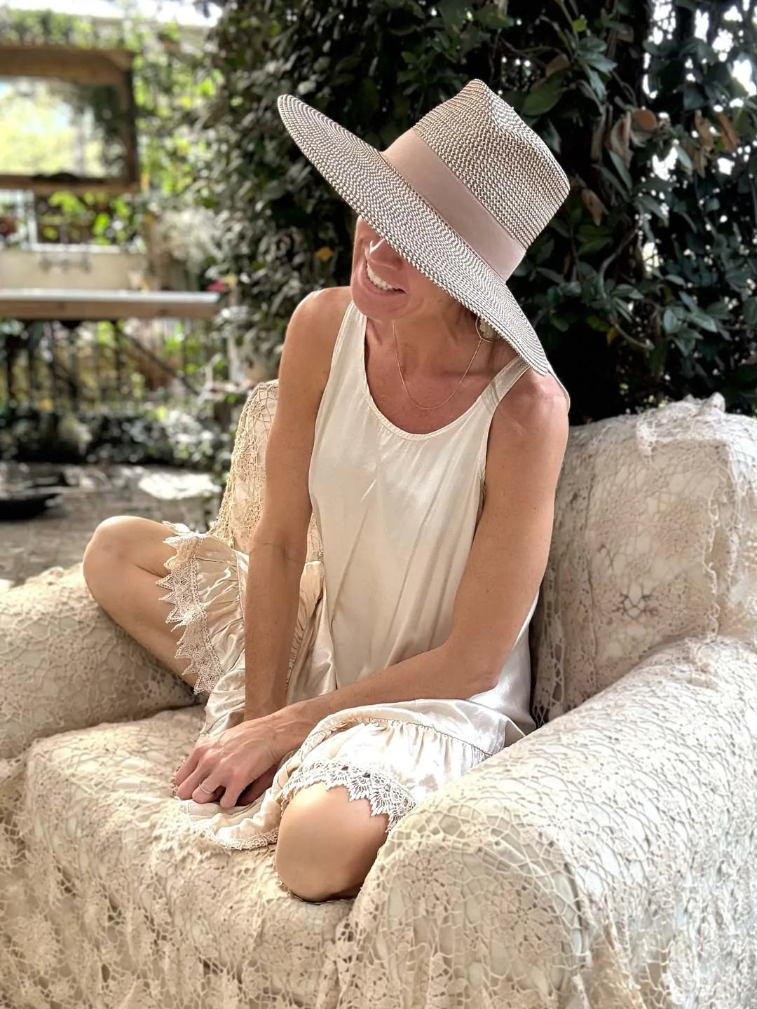 Romantic vintage-inspired black satin slip with lace trim. Tank Sleeves, flattering high-low cut, ruffled hem. Beautiful shiny finish. Can be worn as a dress, under slip, or a nightgown. Our most-loved layering piece. Made in the USA.